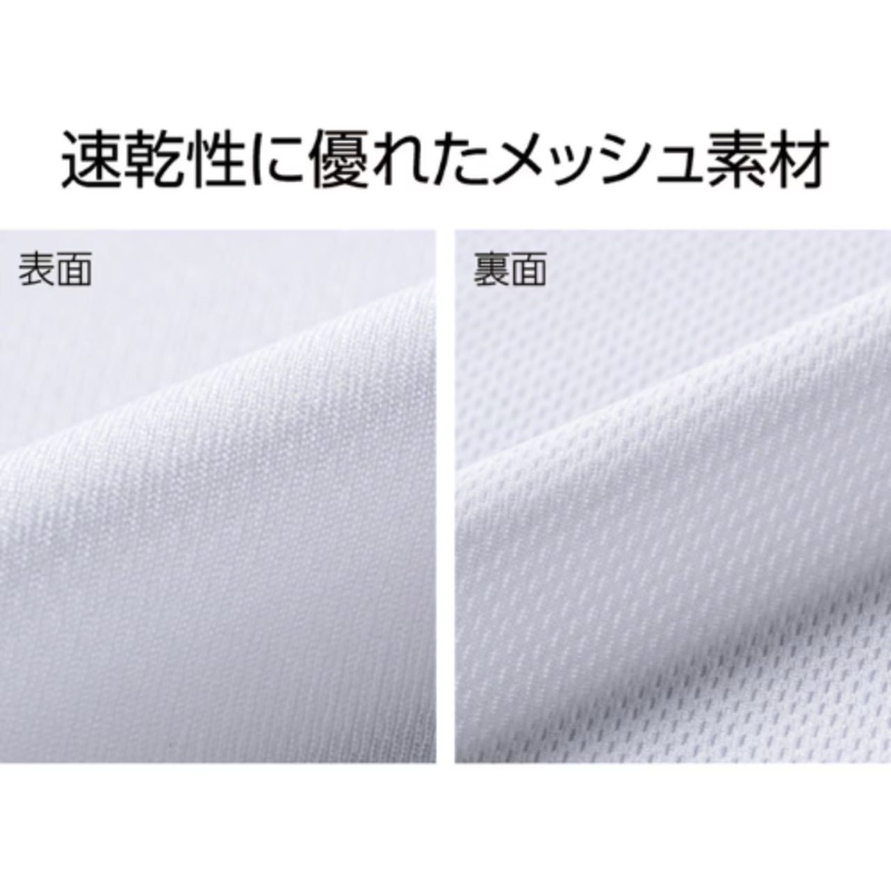 表はなめらか、裏はメッシュ生地。抜群の吸水性と速乾性で綿の2倍以上の速乾性能があります。